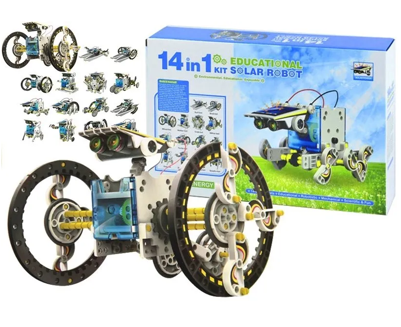 O Kit DIY Robô Solar 14 em 1 foi desenvolvido para crianças de mais de 6 anos de idade, possui 14 combinações de montagem para uma maior exploração da imaginação da criança, construído em abs de alta qualidade, sua alimentação é realizada por energia solar captada pelos painel solar presente no kit.
