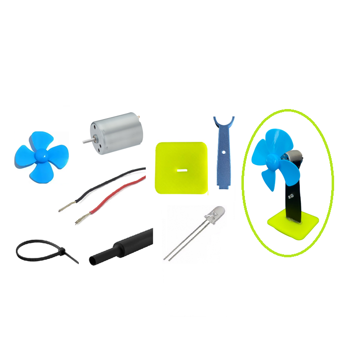 Ao girar as pás, o motor DC converte o movimento em energia elétrica suficiente para acender um LED, mostrando, de forma simples e visual, o princípio da conversão de energia mecânica em elétrica.